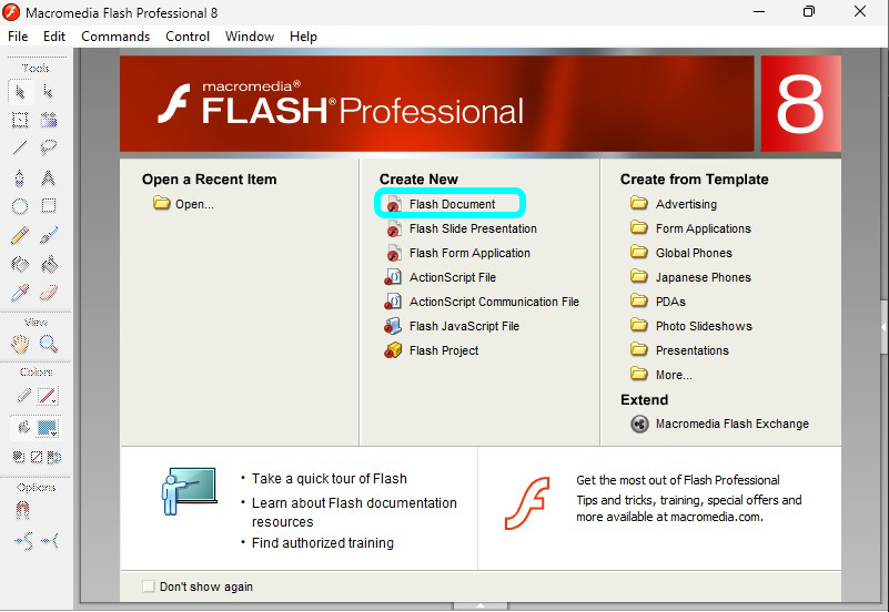 Pilih Open .. untuk membuka dokumen yang pernah di kerjakan sebelumnya atau Create New > Flash Document untuk membuat dokumen baru.
