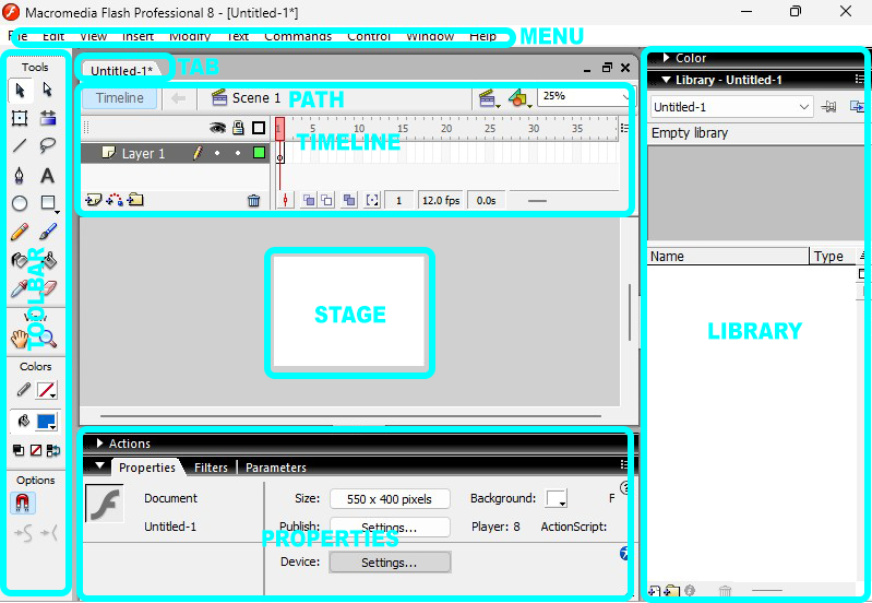 Macromedia Flash 8 merupakan salah satu software populer pada masanya yang digunakan untuk membuat animasi 2D, terutama untuk kebutuhan web, multimedia, dan pembelajaran interaktif. Aplikasi ini dikenal karena kemampuannya menggabungkan gambar, teks, suara, dan animasi dalam satu platform yang relatif mudah digunakan, sehingga menjadi pilihan utama bagi pemula yang ingin belajar dasar-dasar animasi.