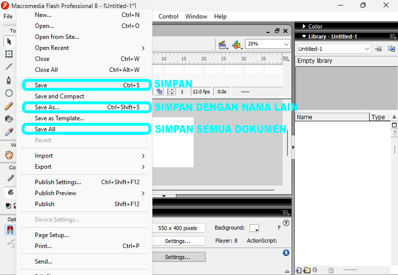 Dalam proses kerja, penting untuk menyimpan dokumen secara berkala agar hasil pekerjaan tidak hilang. File pada Macromedia Flash 8 biasanya disimpan dalam format .fla sebagai file kerja, dan dapat diekspor ke format lain seperti .swf untuk hasil animasi. Pengguna dapat menyimpan file melalui menu File > Save atau Save As, kemudian menentukan lokasi penyimpanan sesuai kebutuhan.